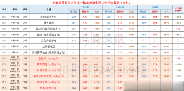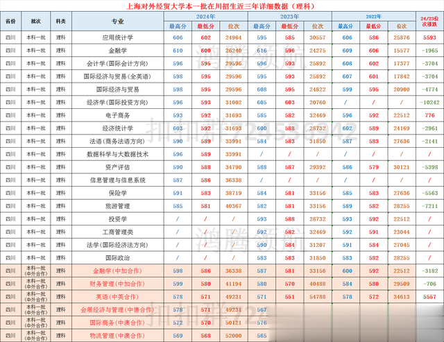 上海对外经贸大学2024年在四川理科普通类减招了“投资学、工商管理类、法学(国际经济法方向)、国际政治”4个专业,新增“数据科学与大数据技术、信息管理与信息系统”2个专业,共14个专业招生40人,录取分数为581,排名40367位次,较2023年下滑7211位次,其中“应用统计学”专业超过传统“金融学”专业获得最高录取分,这是一个可以往火热的“人工智能”上靠的专业,家长们很有眼光。
